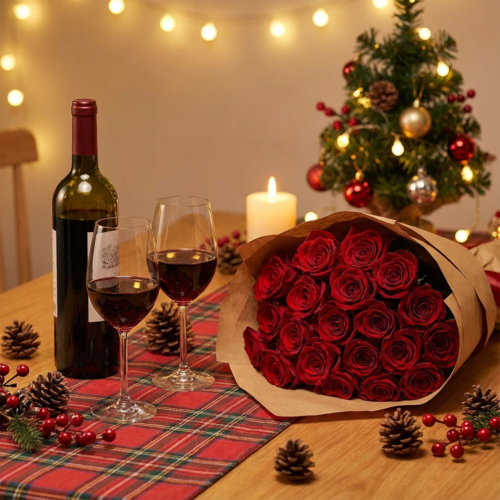 Red wine bottle + bouquet arrangement — perfect for intimate celebrations.