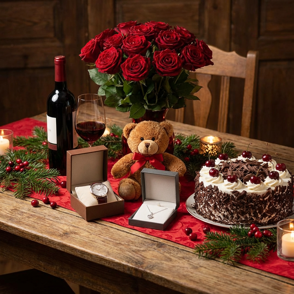flower bouquet + Red Wine bottle + Small Tedi toy + Watch + necklace + Cake